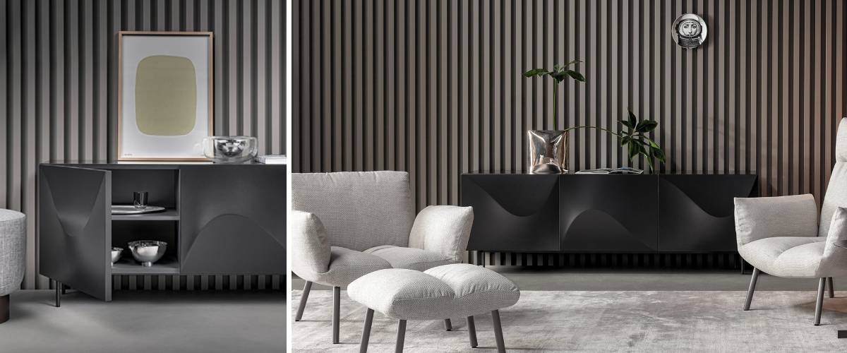 TheVERTIGO cabinet is an elegant low chest of drawers that can be used in dining rooms, living rooms or even the office. You can choose the wooden cabinetbody in 3 design variants. The VERTIGO cabinet has 3 separate compartments. At first glance, the optical effect is striking thanks to the external door shaping. Inside each compartment there are 2 compartments. The VERTIGO cabinet is available in 2 sizes.