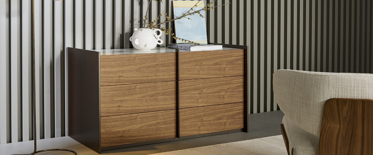 TheAUREO design chest of drawers has a simple shape, yet combines various classic materials in an effective way. The wooden body offers practical storage space divided into 6 drawers, which can accommodate everything you may need on hand in the bedroom. The details of the chest of drawers are made of lacquered metal. The real treat, however, is the ceramic top, which is available in a choice of matt or light finish with a beautiful texture. The AUREO designer chest of drawers has a stylish aura that all connoisseurs will appreciate!