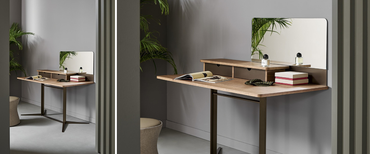TheNELSON designer dressing table offers a truly original design and is guaranteed to be one of the most original things you can furnish your interior with. Its classic shapes and choice of materials also make it a timeless piece that will be relevant in every era. The NELSON dressing table has a high double base in lacquered metal with a central link that promises perfect stability. The table body is made of wood and combines different colour shades in a spectacular way. The worktop is further enhanced by a storage space for writing utensils in the form of 2 handy drawers for embellishments, as well as a rectangular mirror with rounded corners. Essential furniture for every woman who likes to show off!