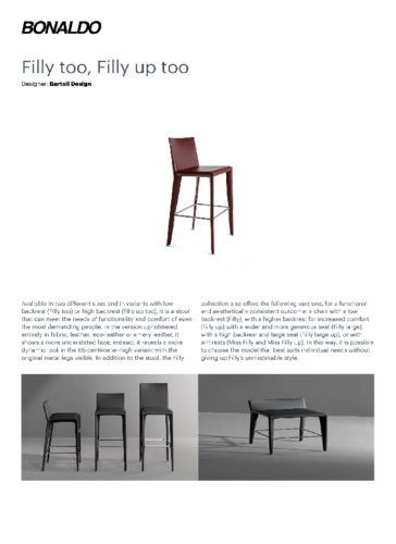 TheFILLY TOO design bar stool is a creation by Bartoli Design for the Bonaldo brand. This exceptional bar stool meets even the most demanding requirements for comfortable seating and a luxurious look. It combines attractive shapes, first-class workmanship and premium materials - a combination perfect for modern interiors. At first glance, the original flattened design of the base will certainly catch your eye. The structure and footrest are made of metal. The legs and shell are covered with upholstery, which you can choose from a wide range of fabrics, leathers or leatherette. The model is available in two heights and in a lower backrest version. You can also buy dining chairs to complete the look of the interior. If you have any questions, please do not hesitate to contact us.