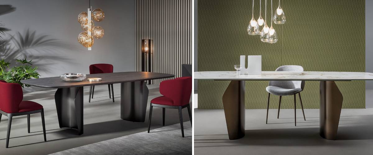 Theluxury FLAME table in various sizes is designed for all interiors where quality and premium materials are important. This exceptional table stands on a distinctive two-legged base made of bent metal, which can be selected in muted shades of matt lacquer according to the interior layout. The table top is truly exclusive and you can choose marble, wood or ceramic in various shades with a refined surface pattern. The table top is available in 5 sizes for every space. A table that has its place in the home and office will be a practical and decorative element for you.