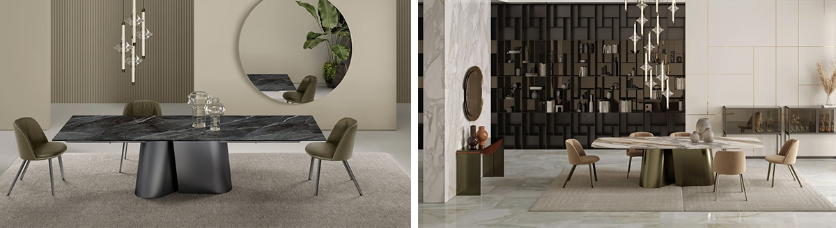 Looking for a dining table for a luxurious interior? KIMONO will make a spectacular effect, offers high variability and will become the focal point of family and social gatherings. This piece comes from the design studio E-ggs. Available in two sizes, the board is available in matt or glossy marble or ceramic in several decors. A wooden table top can also be ordered on request. The organically shaped metal base can be chosen from several lacquer or metallic finishes. A barrel-shaped version of the tabletop is also available.
