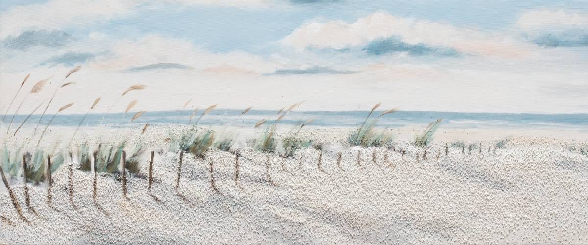 Thestylish painting W909 30x90 cm will transport you to a sandy beach on a windy day. In addition, it will delight you every day on the wall of a classic and modern interior. Bubola e Naibo paintings are hand painted by artists from all over the world. The large horizontal rectangle-shaped canvas depicts sand dunes and ears of grain tilting in the wind. It is rendered in subtle muted tones that combine beautifully within the space. Also notable is the grainy surface texture , which gives the image an authenticity. Let art into your home or office that inspires and uplifts the soul. The canvas can be ordered unframed or with a frame of your choice from the catalogue.