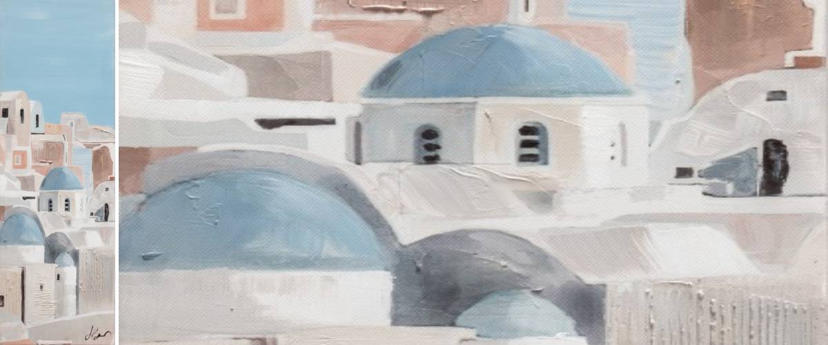 Stylish painting W912 30x90 cm will be loved by all fans of ancient Greek architecture and holiday destinations. Every day you can enjoy this on the wall of a classic or modern interior. Bubola e Naibo paintings are hand painted by artists from all over the world. The vertically oriented rectangle-shaped canvas depicts the typical buildings of Santorini Island stacked in rows on top of each other under a bright blue sky. It is rendered in elegantly understated and muted tones that will blend beautifully within the space. Also remarkable is the subtly sculptural surface texture , which gives the image an added authenticity. Let art into your home or office that inspires and uplifts the soul. The canvas can be ordered unframed or with a frame of your choice from the catalogue.