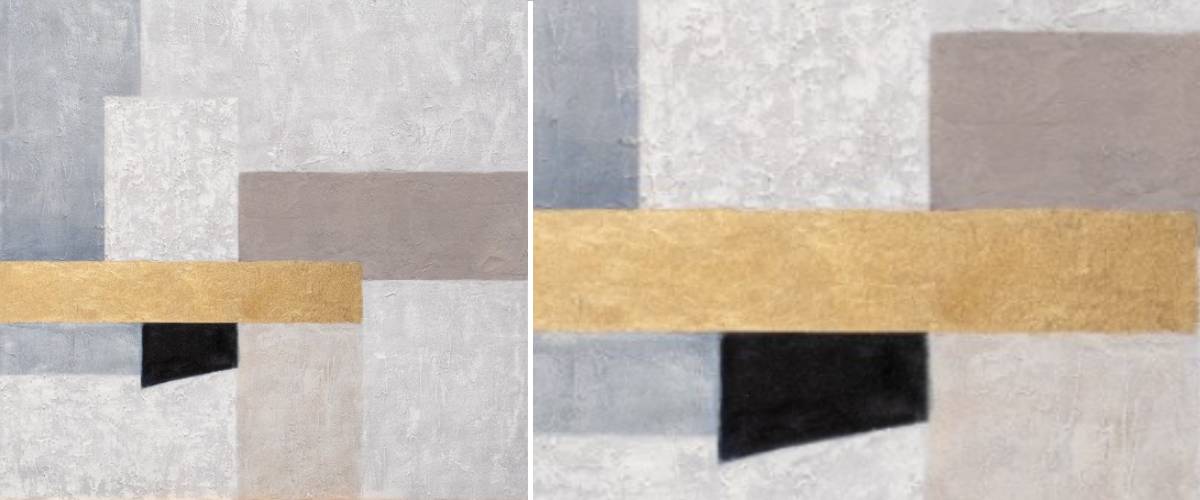 Thestylish painting Z720 100x100 cm is in the spirit of the current trends of abstraction and geometric shapes. This makes it particularly suited to the wall of a modern interior. Bubola e Naibo paintings are hand-painted by artists from all over the world. The square-shaped canvas depicts simplistic stripes and rectangles whose interpretation is up to you! The scene is painted in soft neutral pale blue, grey, golden and beige tones with a few accents. You can easily match these colours with any accessories and furniture. Also notable is the rough , sculptural texture of the surface, which adds to the authenticity of the painting. Let art into your home or office that inspires and uplifts the soul. The canvas can be ordered unframed or with a frame of your choice from the catalogue.