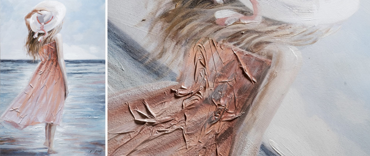 The delicate painting W714 60 x 90 of a girl on the seashore is imbued with summer and nostalgia. Its concept makes it stand out especially in modern interiors. The work is hand-painted on canvas by professional artists, so each piece is original and will satisfy even demanding clients. Thanks to acrylic paints in combination with other materials, the painting has an interesting structure with a plastic effect. Acrylic paints are known for their colour fastness, so the painting will adorn your interior unchanged for many years. The painting can be ordered with different types of frames to match your interior. The painting comes with a certificate confirming that this painting is a true original.