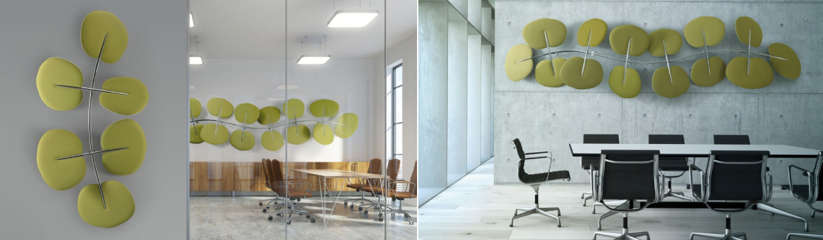 Botanica acoustic panel absorbs sound with SNOWSOUND® technology with variable density polyester fill. But Botanica is more than that, it is a design piece with considerable aesthetic and formal impact that can create a wide range of compositions with designs that are always new. It is made up of 4 - 6 leaf-shaped panels on a chrome-plated steel structure. The Trevira CS® fabric upholstery is available in several colours.