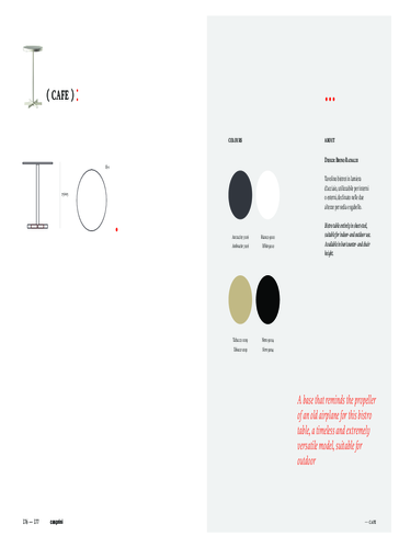 The stylish CAFE coffee table from the Italian manufacturer Casprini, with its original base that resembles the propeller of an old airplane, is a suitable addition to both indoors and outdoors. Thanks to its timeless design, it is suitable for both residential, restaurant and office environments. The steel structure of the table, including the round table top, comes in a lacquered finish. You can choose from several colours and table sizes.