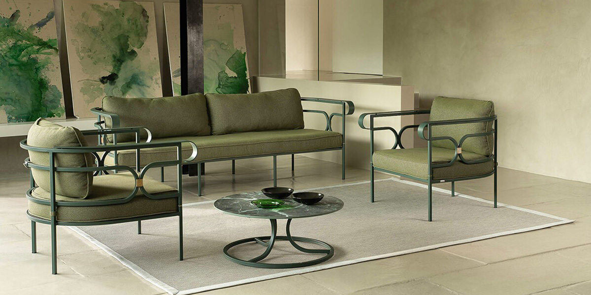 The COLLIER armchair, designed by LCM Marin Design Studio, impresses with its elegant silhouette and harmonious proportions. The design combines classical inspiration with subtle geometric contrasts, making it suitable for sophisticated interiors and exteriors, from private terraces to hotel and catering projects. The structure is made of steel in several shades of lacquer, while the seat is made of stretched steel mesh with a characteristic decorative motif that gives the collection a distinctive aesthetic. A decorative detail in brass is also a typical feature. For seating comfort, the chair is complemented by a seat and backrest in a variety of upholstery colours available for outdoor use. The soft lines of the entire COLLIER collection create a pleasant seating experience that combines lightness with functionality and durability.