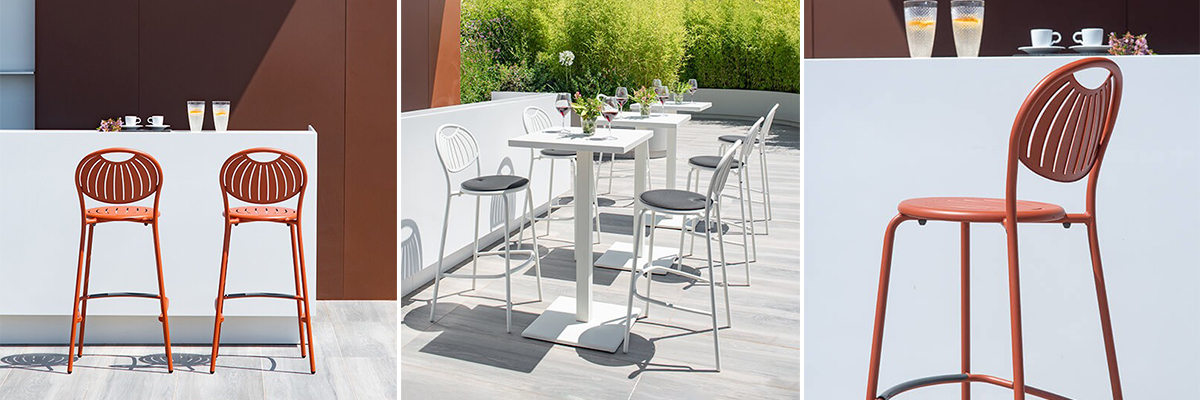 Looking for the perfect outdoor bar seating that will withstand all the vagaries of the weather and look perfect to boot? The COUPOLE bar stool is a modern reinterpretation of a historical bestseller and meets all these requirements. Its backrest and name were inspired by the dome of Brunelleschi's dome in Florence. It is made of durable steel in a variety of colours. It's up to you whether you choose one shade or combine several. For even more comfort, you can add a magnetic or classic seat cushion.