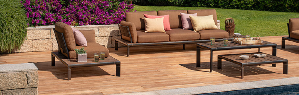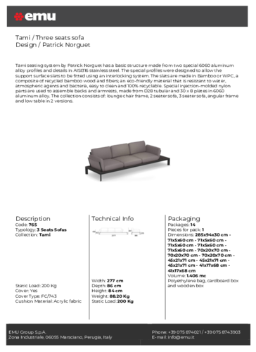 TheTAMI sofa has an aluminium structure on which the seat part is located, which is made of WPC material. WPC is a composite of recycled bamboo wood and fibres, it is an eco-friendly material that is resistant to water, atmospheric conditions and bacteria, easy to clean and 100% recyclable. The inner material of the TAMI seat under the cotton cover is water repellent. You can choose from a total of two base options and several fabrics for the seat upholstery.