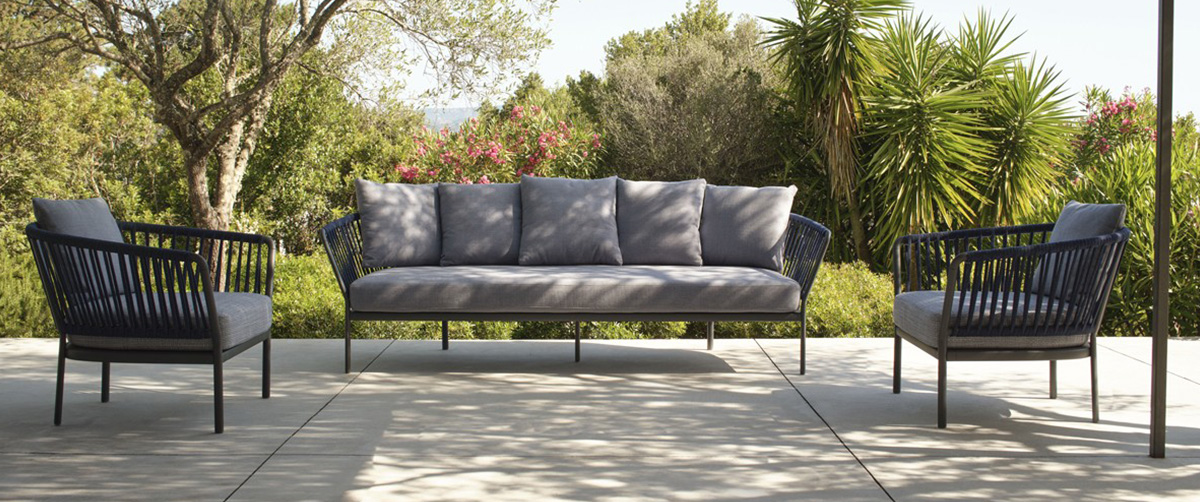 Inspired by the poetic coves of Galicia, designer Alberto Lievore has created the silhouette of the RIA sofa, which hugs the body in the same way that the coastline hugs the sea and incoming ships. The structure in painted aluminium is available in a range of colours. The backrest is knitted with polypropylene cord in the shade of your choice. The seat offers a padded arm in many designs during any weather. Custom material can be used for the seat cover if desired. For even more comfort, we recommend adding a soft cushion. Are you planning to furnish your entire patio, garden or pool area? Browse the entire collection and ensure an elegant, high-quality and comfortable outdoor experience.