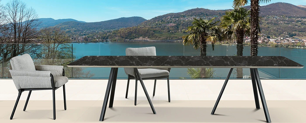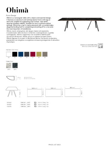 The Forsix design studio projected geometrically precise shapes, variability and durability into the OHIMA table . The sturdy base made of painted metal and technopolymer in several available colours supports a plywood top that can withstand all weather conditions. Choose from two decors. OHIMA is available in many sizes and is suitable for a private terrace, a hotel pool or a restaurant. It will seat a lot of guests and bring a good dose of luxury to the space.