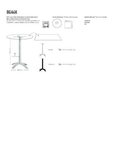 Looking for a new table for your bar, restaurant or dining room? Don't underestimate the choice of the base, which must be robust, stable and made of quality materials. The BGA4K table base with a height of 1150 mm and four legs does all this. The base can be ordered in aluminium or black lacquer and does not include a table top. This must be ordered and its ideal dimensions are 70 cm diameter or 70 x 70 cm. Not sure which option to choose? Contact us and we will help you choose the right piece.