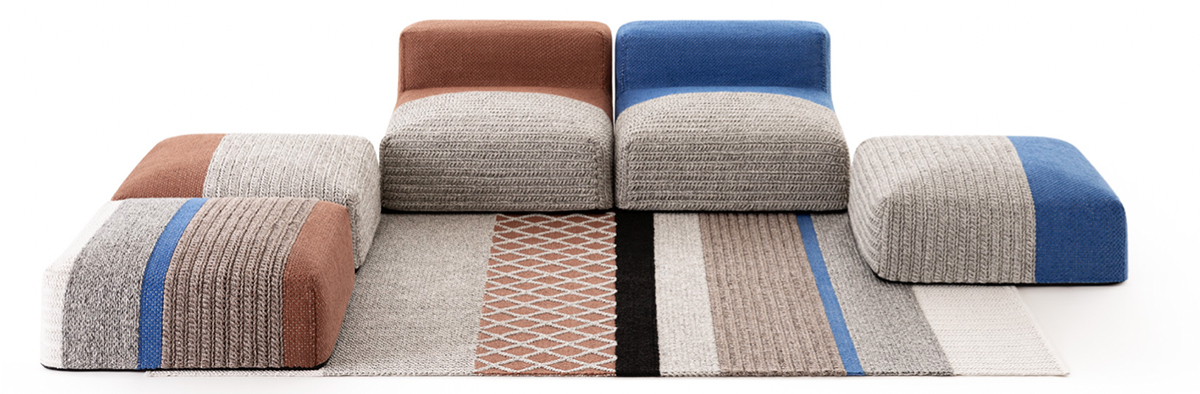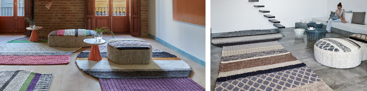 MANGAS ORIGINAL is an unconventional and cosy range designed by Patricia Urquiola. It is made up of organically shaped rugs and poufs that depart from the conventional rectangular format and feature colourful and warm textures, similar to the woollen sweaters from which the collection takes its Spanish name. The individual pieces combine beautifully to give the interior a pleasant and harmonious atmosphere. Each piece is handmade in India by expert artisans using some of the finest natural and recycled fibres. The craftsmanship of this collection supports the economic development of the area where they are made.