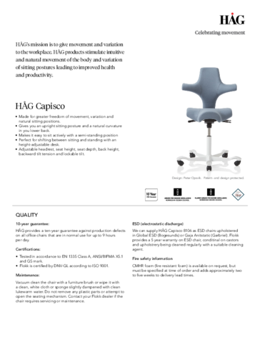 The ergonomic Capisco chair/stool with circular footrest has a shorter seat with a rounded front. The seat thus allows you to sit in a lower or higher position according to your needs. It is designed to provide the necessary support in the natural position of your body. The height of the chair's plunger is 265 mm, so the seat height ranges from 530 mm to 790 mm. This plunger size is suitable for height adjustable tables. Choose from many upholstery colours for the ideal combination in your interior. The base is available in painted metal or in combination with polished aluminium. The type of base is determined by the surface on which the chair will be used - castors for floors and carpets or glides. A minimum of 50% recyclable materials have been used in the manufacture of the Capisco chair. The chair is GREENGUARD-certified , which guarantees that strict standards for chemical emissions have been met during production. Use the 3D product configurator to view your chosen model with all the accessories.