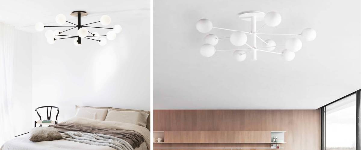 The COSMOPOLITAN design ceiling light will become a new work of art in your interior. This unconventional and bold luminaire is an expression of modern retro elegance. It will also captivate fans of the beauty of spherical glass structures. The luminaire is metallic in a matte black finish and with brass details. The main structure consists of round diffusers made of acid-blown glass shaped in a milky finish. Choose yours from 2 sizes and be enchanted by the extraordinary COSMOPOLITAN ceiling light!