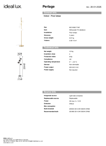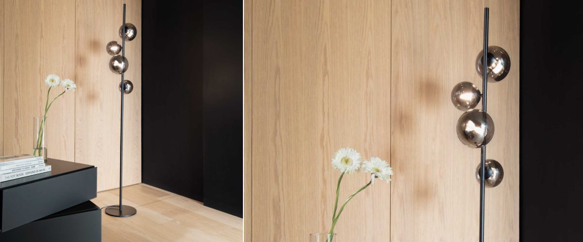 The PERLAGE designer floor lamp will become a new work of art in your interior. This unconventional and bold light is an expression of modern retro elegance. The overall look seems to be inspired by exquisite pearl jewellery. The metal structure on a stable circular base supports four glass spherical shades of different sizes. You can choose between a white or amber finish, which is combined with a brass frame, or smoked glass on a black frame. You can also find the model in a wall-mounted version. Take advantage of the extended five-year warranty on the PERLAGE table lamp!