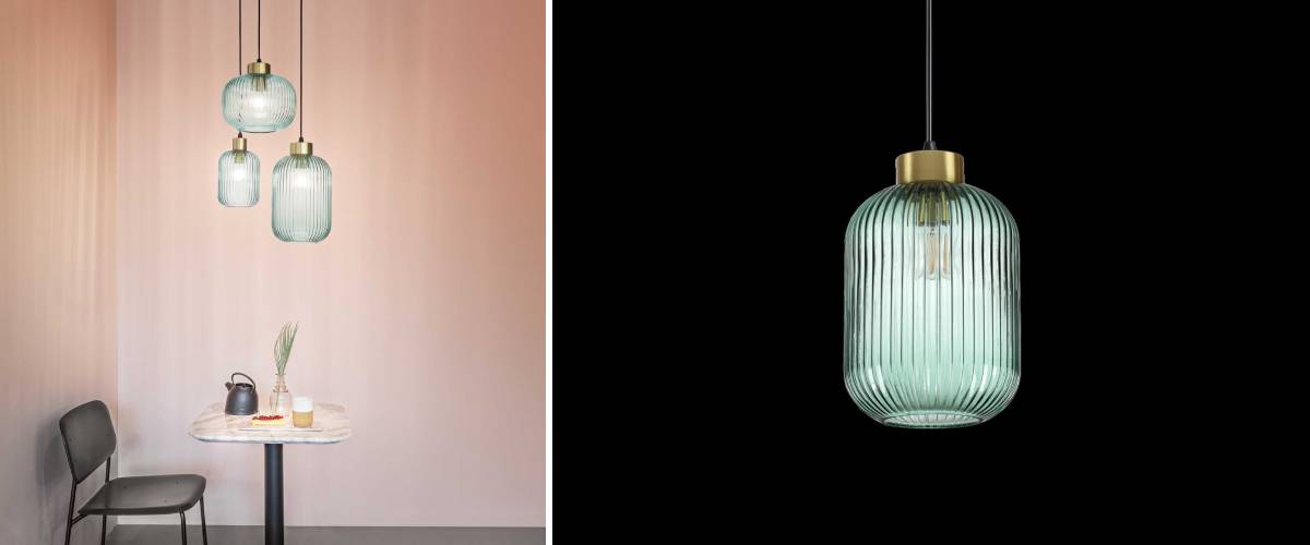 The stylish MINT pendant lamp is a piece for all fans of glass design. It will suit both classic and modern interiors without distinction. The gracefully shaped light has a metal frame with a brass finish and a ceiling base in matte black. The lantern-shaped shade has a decorative vertical relief and is made of blown glass. You have a choice of smoke or mint colour options and 3 sizes. The electric power cord is made is spectacularly coated with fabric. The stylish MINT pendant lamp is a piece for any type of interior that has a strong genius loci.