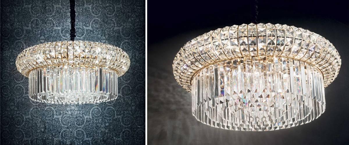 TheNABUCCO designer pendant lamp pays tribute to the exceptional Italian style. Designed more for modern interiors, the light has a metal frame with a luxurious gold finish. The upper convex part of the shade is decorated with square transparent crystalline elements that reflect the ambient light. At the bottom of the shade, these crystals are diamond-shaped. The whole structure is held by a metalhanging chain in gold . The NABUCCO designer pendant lamp will bring the spirit of Italy to your home every day. Choose yours from 2 sizes!
