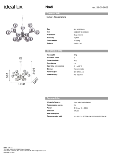 The elegant NODI pendant lamp is the type of lamp that will look stylish in any era and in any interior. It was inspired by the shape of atomic structures. The frame of the light is metal, in satin brass or chrome. The 15 round diffusers are made of acid-blown glass in chrome or white. The NODI pendant lamp is also available in other versions in our catalogue. It will dazzle in the home, but especially in public and commercial spaces.