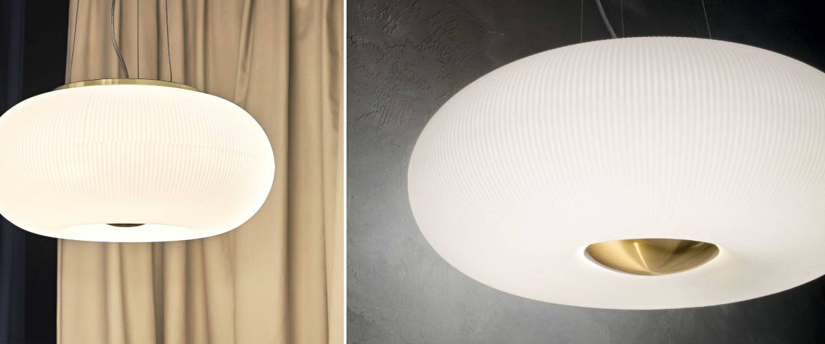 Thanks to its timeless style, theelegant ARIZONA pendant lamp will stand out in both modern and classic interiors, where it will resemble a charming lantern. The light has a metal frame and decorative elements with a satin brass finish. At first glance, however, you will immediately be drawn to the massive spherical-shaped diffuser with its distinctive decorative vertical relief. It is made of acid-modulated blown milk glass. The lamp is suspended on 3 steel cables and is offered in 2 sizes. The ARIZONA hanging lamp will become a beautiful central element of the room. It will stand out especially in the kitchen, in the dining room or in any room to give a cosy home atmosphere.