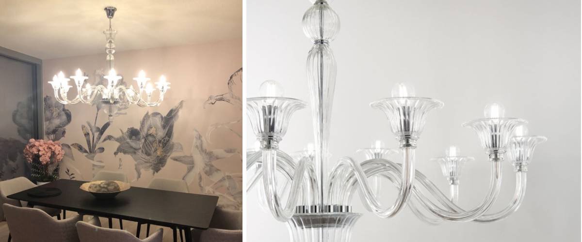 TheBRIGITTA design pendant lamp is the ideal compromise for all fans of classic shapes, but in a modern context. This flamboyantly elegant luminaire has a sturdy metal frame andarms in your choice of amber or transparent finish. The decorative details are made of blown glass in the colour of your choice. The unusual round bulbs combined with the glass bases give the impression of flowers. You can choose them in number according to the size of the chandelier from 2 variants of this model. The entire structure is held securely by a hanging chain wrapped in striped velvet. The BRIGITTA design pendant lamp will decorate any room in your home.