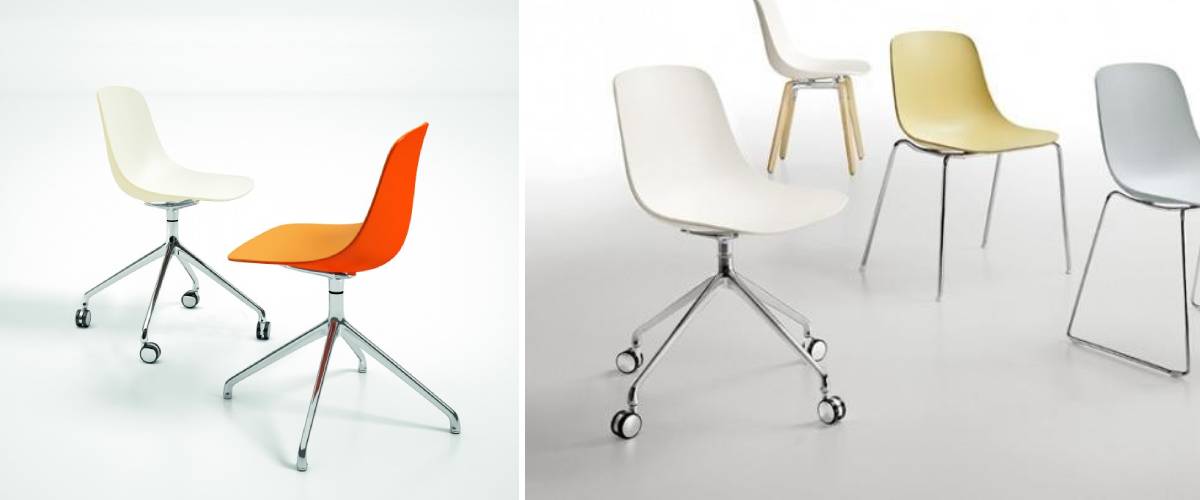 The PURE LOOP BINUANCE swivel chair on castors stands on a central swivel base on a four-legged cross with castors. You can choose between a chrome or painted steel version. You will also find variants with different types of bases in the catalogue. The comfortably selected seat and backrest are made of high-quality injection moulded polypropylene reinforced with glass fibre. You can choose them in 4 attractive colours.