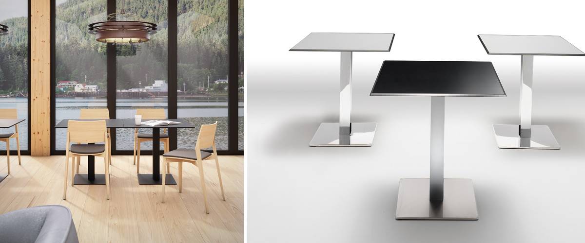 The Plano 710 design dining table stands on a single central base in painted steel or chrome. The square table top is made of laminate, HPL or Fenix, which is a super-matt high-pressure laminate, and is available in several finishes. It is available in 3 sizes. This table is extremely suitable for commercial spaces such as restaurants or cafes.
