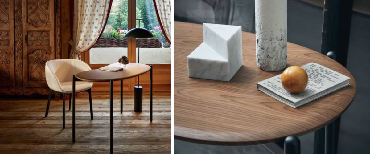 TheLUNAT design table will delight all those who love simple yet imaginative furniture. Moreover, you can use this model in many ways, whether as a storage table, a small dining table, a work corner or for a ladies' toilet. The tall and slender four-legged base is made of black lacquered metal, while the bean-shaped table top is made of natural walnut wood. You can easily match the LUNAT table with any type of modern or classic interior.