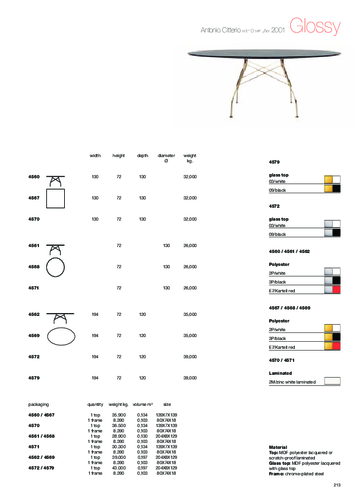 | Material | deska: lakovaná MDF, nohy: chromová nebo zlacená ocel |