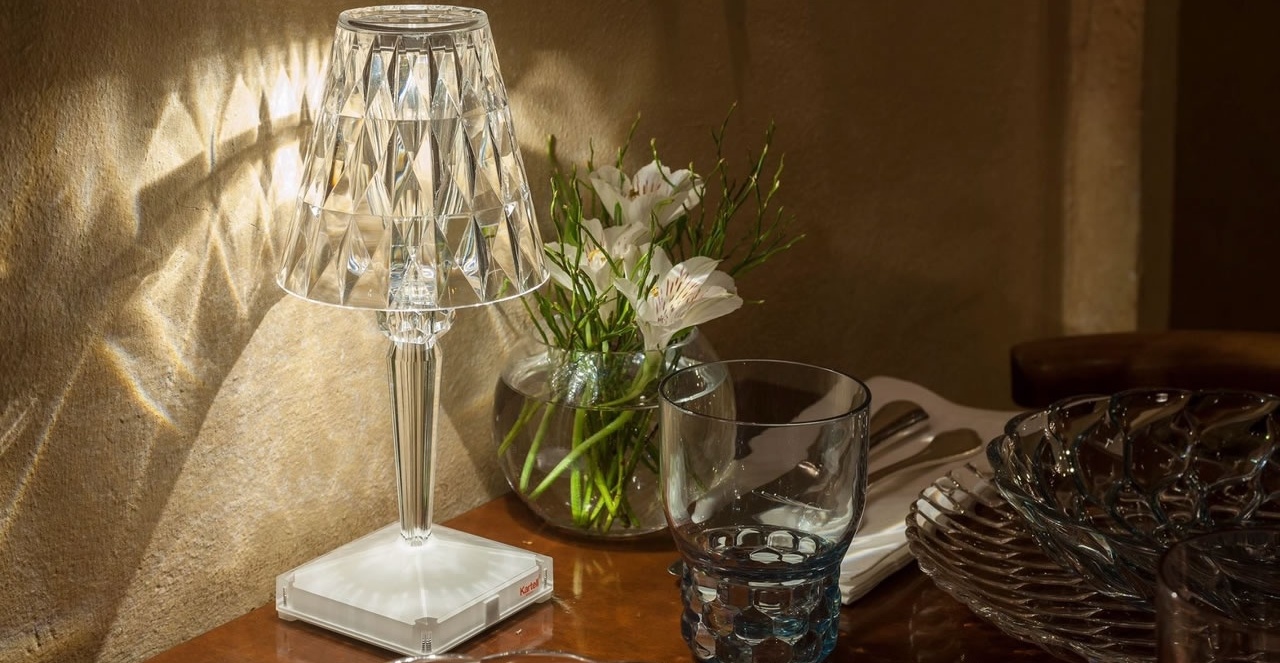 Batteryis an iconic design compact lamp, made of transparent PMMA plastic with integrated 0.8W Led light.The product is a collaboration between Kartell and the world-renowned designer Ferruccio Laviani and is the ideal companion for outdoor use - in gardens, terraces, outdoor restaurants and cafes, as it can stay lit for up to seven hours after charging. Thanks to the unique structure, the beautiful reflective properties of the material stand out, with magical reflections of light on the unique luminaire.