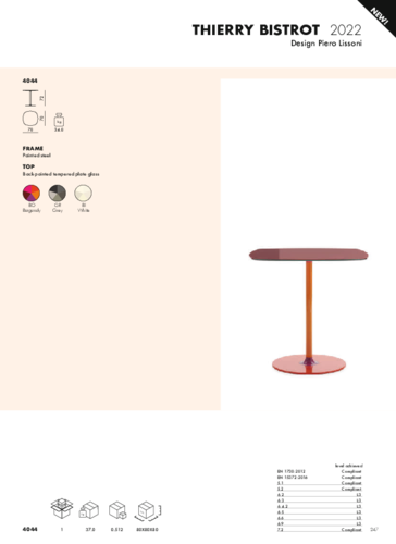 The THIERRY BISTROT table by designer Pirro LisSoni is the ideal solution for all modern and creative businesses and private interiors. Thanks to its table top in coloured tempered glass, it gives a luxurious and unpretentious impression. The table is available in several complex colour finishes. The lacquered metal base always contains a spectrum of matching shades, while the glass top shines like a precious diamond. Explore the entire collection and don't be afraid to be seen!
