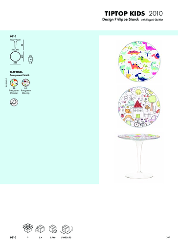 This piece is the result of a collaboration between Kartell and the world-famous designer Philippe Starck. The multifunctional Top Top table range, from which the table is based, is characterised by its minimalist, elegant design. The transparent clear base is combined with a colourful table top with a dinosaur pattern or drawing that will delight every child's soul.This version of the table is suitable for outdoors and its dimensions are 48.5 x 50 cm(diameter x height). If you have any questions, please do not hesitate to contact us.