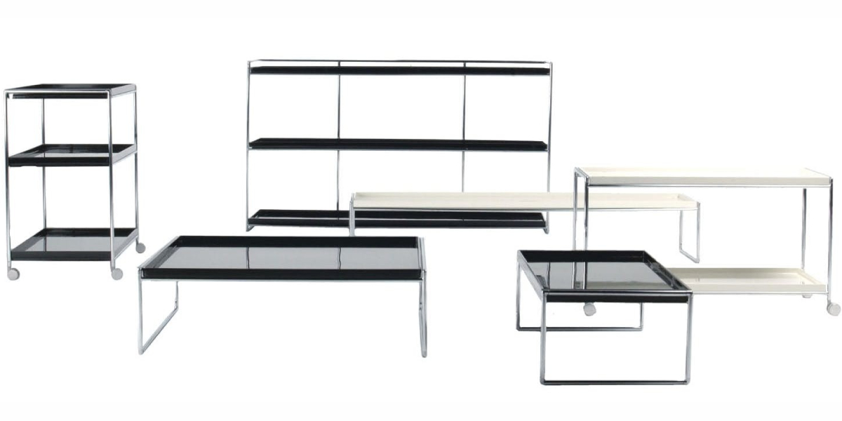 The table is a collaboration between Kartell and designer Piero Lissoni. The Trays collection includes coffee, storage and serving tables suitable for the home or office, with shapes reminiscent of lacquered Japanese trays. The tables are available in glossy white or black with a chrome-coloured structure. The dimensions of this model are 80 x 40 x 72,5 cm (width x depth x height).