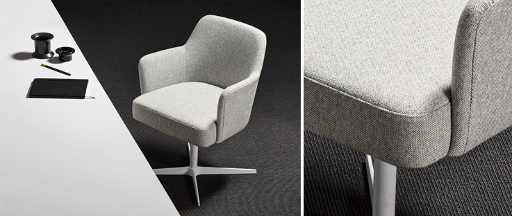 The elegant Velour swivel chair with a lacquered metal base with central base is unique for its generous upholstery. The upholstered seat and backrest, available in a wide range of fabrics and leathers, will take care of your comfort. Didn't choose from our wide range? No problem. Just send us your own material and we will make the chair out of it.