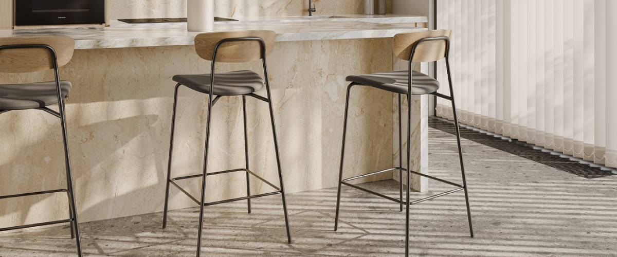 Theminimalist TRIVI bar stool with upholstered seat is a wonderfully versatile modern model that fits in perfectly with current trends. It recreates the classic timeless morphology with premium materials and top quality workmanship. The slender steel construction looks very airy and elegant. It is available in white, black and bronze. Of course, the base also features the typical footrest. The simplistic seat and backrest combine beech plywood with oak veneer and are available in natural or black. The seat is upholstered in the fabric and shade of your preference. We recommend adding soft glides to the chair for hard floors. We offer this handsome bar stool in 2 heights. The TRIVI bar stool is the perfect choice for home kitchens and commercial interiors.