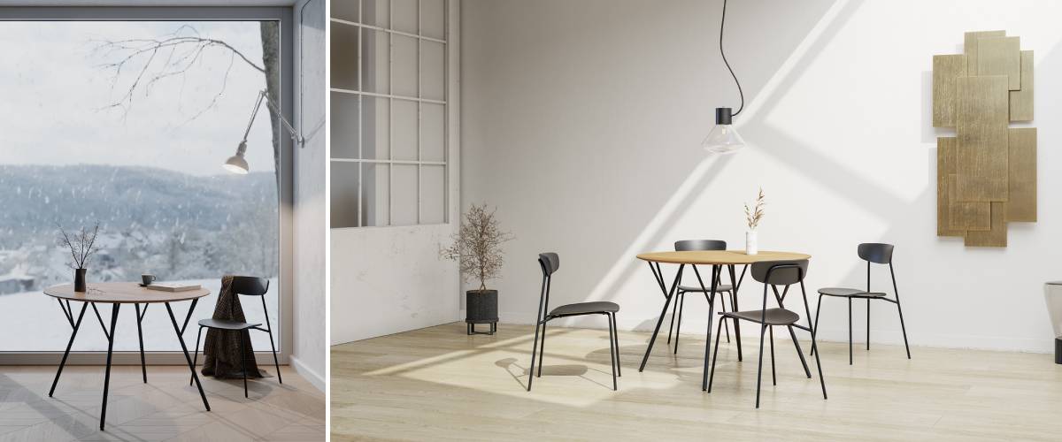 Theminimalist TRIVI dining table is a wonderfully versatile modern model that fits in perfectly with current trends. It interprets the classic timeless morphology using premium materials and in top quality workmanship. The slender structure in lacquered metal looks very airy and elegant. It is available in white, black and bronze. The round table top can be selected in natural oak plywood or white laminate. The lightweight TRIVI table is the perfect choice for home and commercial interiors of cafes and restaurants. We recommend complementing the table with chairs from the same collection.