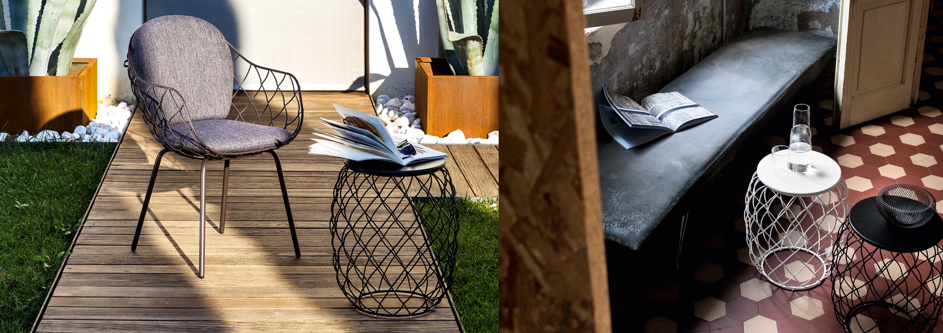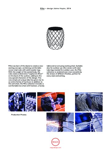 The Piña collection was born out of a desire to create an innovative seating concept. Designer Jaime Hayón took this idea and created a collection for Magis with a simple but unique idea. The combination of a comfortable seat cushion with urban steel rods in a capitonné effect reminiscent of pineapples provided the supporting element for the entire Piña collection. The combination of different colours and material finishes makes the collection a set of pieces that fit any space. In the Piña collection you will find a chair, an armchair, an ottoman, a chic coffee table and a rocking chair, the pieces can also be complemented with a comfortable yet designer cushion.