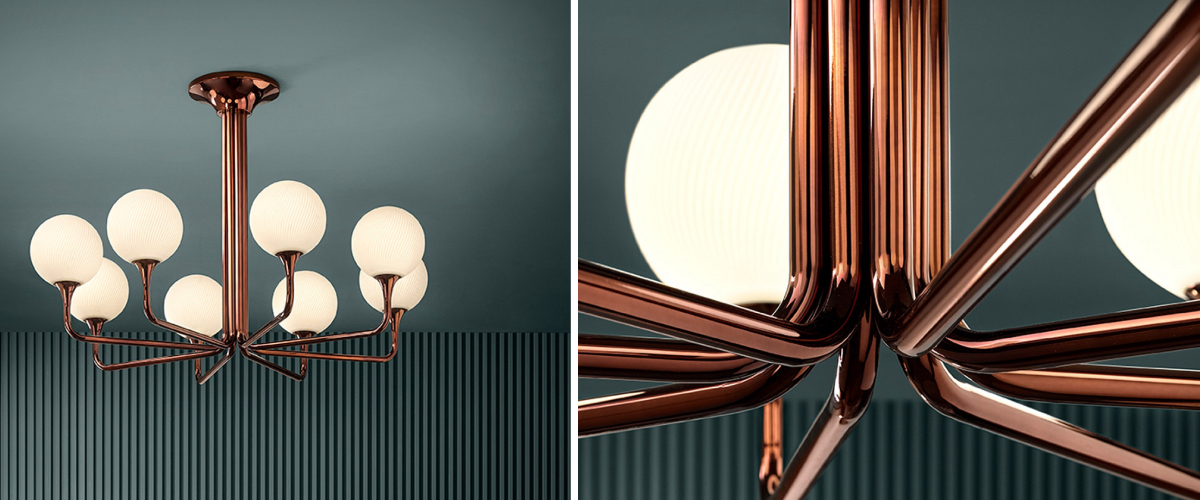 TheTEE PL8 designer ceiling lamp is a timeless classic with elements of retro elegance. The robust and dazzling ceiling lamp gives a truly royal atmosphere to the interior - it is suitable not only for homes, but also for offices, public and social spaces and lounges. This exceptional chandelier is available in 2 sizes. The solid frame of the luminaire on a massive foot base is made of galvanised metal and is available in a variety of glossy or matt finishes, or in a trendy copper shade. The arms of the structure are topped with spherical luminaires with milky shades made of Murano glass. Show the world your exquisite taste!