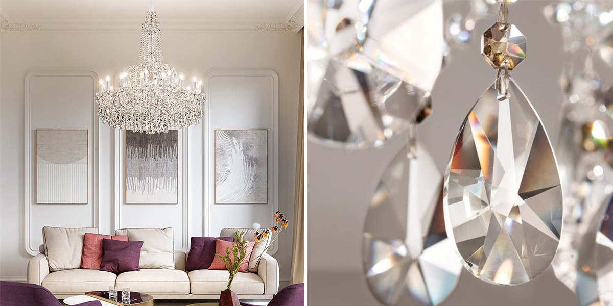A contemporary interpretation of the classic crystal chandelier and a luxurious interior dominator. The sumptuous AQABA pendant lamp adorns a lobby, hotel lobby, restaurant, bedroom or living room. It consists of a galvanised steel structure in gold or chrome, glass-covered arms and shimmering cascades of half-cut and cut glass crystal pendants and premium crystal.The light source is 24 E14 10W max LED bulbs, not included. However, you can also choose the integrated adjustable RGB or DW LED bulb system. If you have any questions, please do not hesitate to contact us. Would you like a different size or complementary luminaires to unify your entire home or business? Explore the entire AQABA collection.