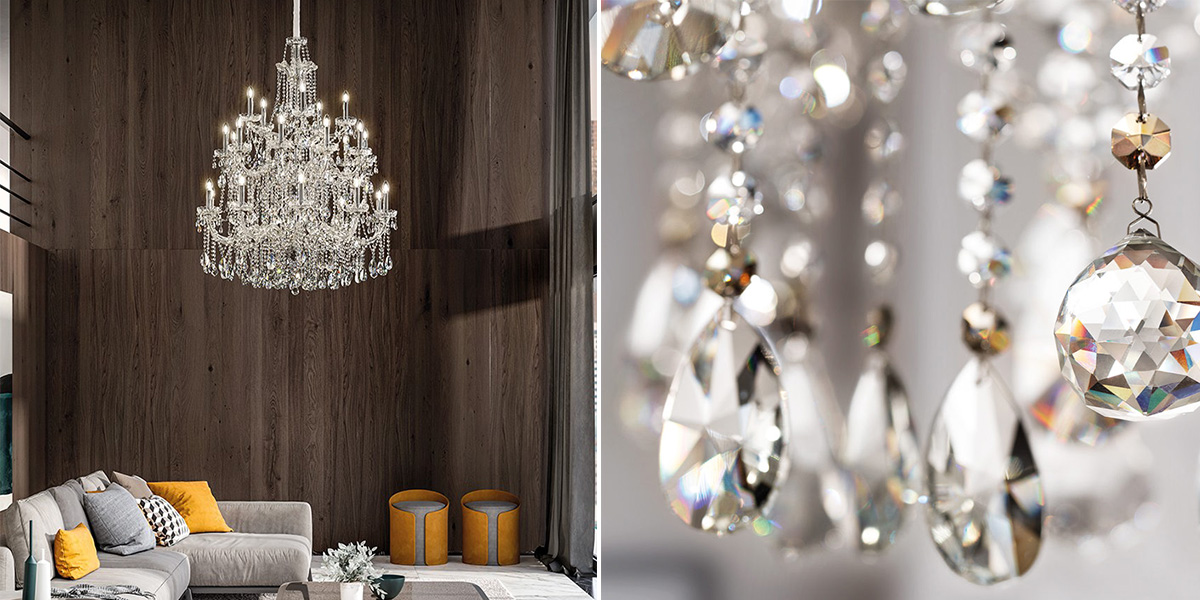 A contemporary interpretation of the classic crystal chandelier and a luxurious interior dominator. The sumptuous AQABA pendant lamp adorns a lobby, hotel lobby, restaurant, bedroom or living room. It consists of a galvanised steel structure in gold or chrome, glass-covered arms and shimmering cascades of half-cut and cut glass crystal pendants and premium crystal.The light source is 25 E14 10W max LED bulbs, not included. However, you can also choose the integrated adjustable RGB or DW LED bulb system. If you have any questions, please do not hesitate to contact us. Would you like a different size or complementary luminaires to unify your entire home or business? Explore the entire AQABA collection.