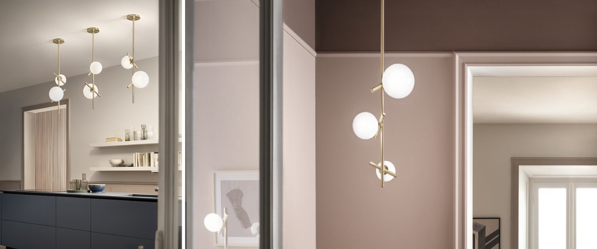 Theelegant POSY vertical pendant lamp is a reflection of balance and simplicity. The entire collection is designed as a combination of different compositions of glass spherical diffusers made of opal milky Murano glass suspended from delicate metal stems. The design of this luminaire is available in several finishes of electroplated or matt lacquered metal. Choose from two sizes. With its natural beauty, this piece will brighten up private and commercial interiors and bring a generous dose of elegance to them.