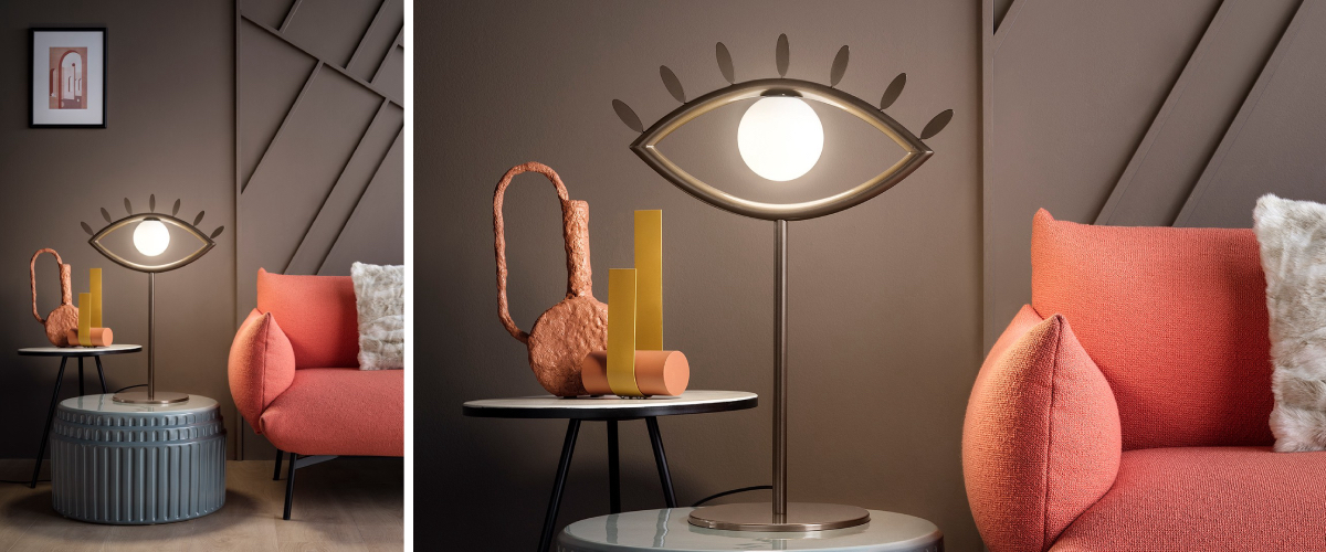 TheVISIO designer table lamp adds a touch of true originality and unusualness to your modern interior. Do you want to attract attention? Then this is the ideal choice for homes, but also offices or commercial spaces! The table lamp in the shape of a human eye has a vertical structure with a stable circular base supporting a frame representing the shape of an eye with eyelashes made of lacquered metal. The structure and frame can be chosen in glossy or matt finish from a wide range of colours. Inside the frame is a spherical luminaire with a milky shade made of Murano glass. From the VISIO collection you will also find other elements with which you can create the outline of your entire face on the wall!