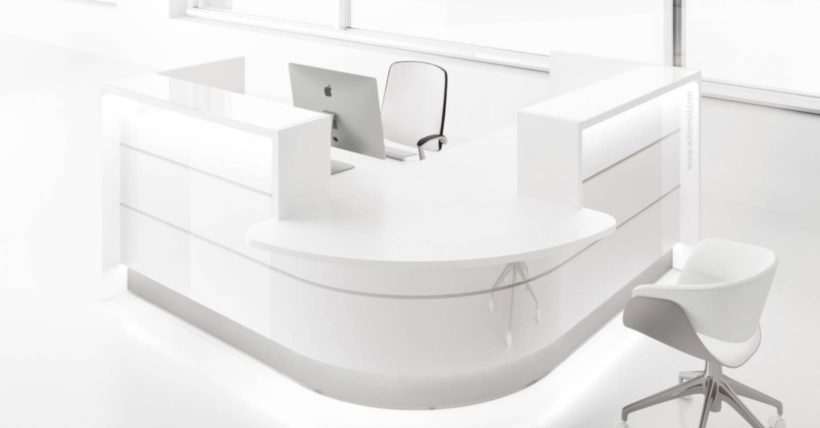 This timeless reception desk with glossy white elements evokes airiness and purity of space. Complementary colours can then be chosen to suit your corporate identity. Aluminium horizontal rails add dynamism to the overall design. Thanks to their versatile character, the reception desks from the Valde range are suitable for various types of interiors and instantly breathe new life into them!