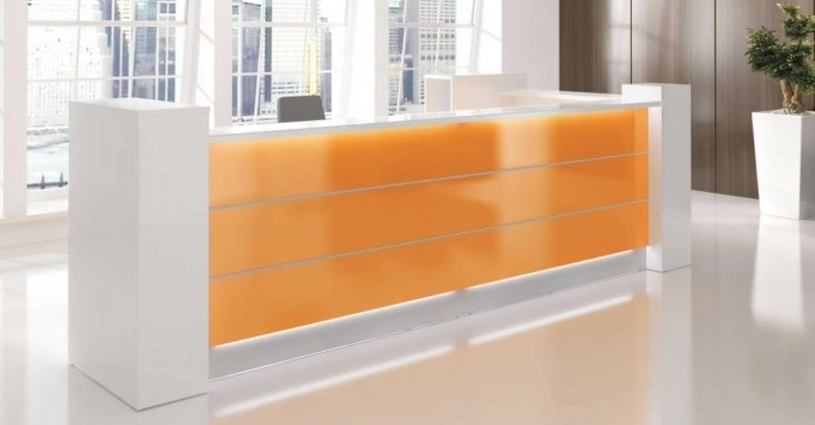 This timeless reception desk with glossy white elements evokes airiness and purity of space. Complementary colours can then be chosen to suit your corporate identity. Aluminium horizontal rails add dynamism to the overall design. Thanks to their versatile character, the reception desks from the Valde range are suitable for various types of interiors and instantly breathe new life into them!