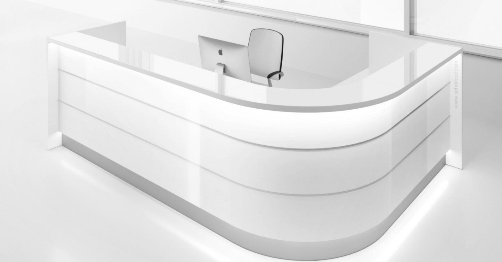 This timeless reception desk with glossy white elements evokes airiness and purity of space. Complementary colours can then be chosen to suit your corporate identity. Aluminium horizontal rails add dynamism to the overall design. Thanks to their versatile character, the reception desks from the Valde range are suitable for various types of interiors and instantly breathe new life into them!