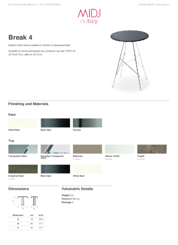 The BREAK collection from the Italian brand MIDJ impresses with its original design of the base, which exists in three or four legs in painted metal or chrome. For outdoor use, for example in the gardens of cafés or bistros, there is also the option of an outdoor finish. The plates are either glass or metal, with a choice of two sizes.