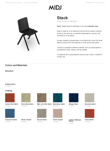 The design duo Martini & Dall'Agnol, in collaboration with the renowned MIDJ brand, have created the innovative STACK chair, which combines user-friendliness and a distinctive aesthetic. As the name suggests, an important feature of the chair is its stackability up to 12 pieces. The polypropylene base, available in neutral and playful colours, carries a simple shell in oak or walnut wood or lacquered veneer. STACK adapts to any public or private space. Felt gliders can be purchased for the base. Browse the entire collection and choose the one that best describes your lifestyle.