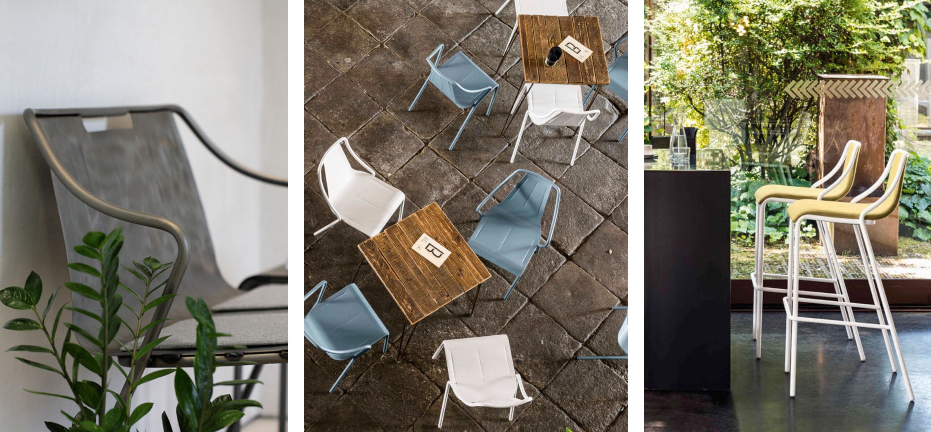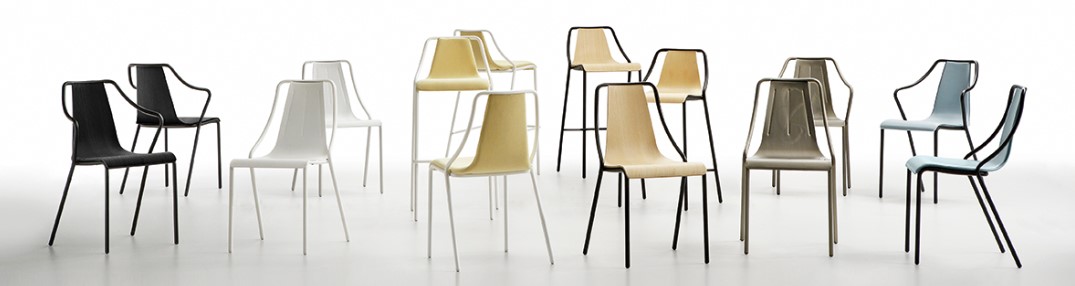 The collection includes chairs, bar stools, a bench and several types of tables. The unpadded types in an outdoor finish are ideal for the outdoor gardens of cafes and restaurants. All chairs are stackable, making them suitable adepts for conference and meeting rooms.